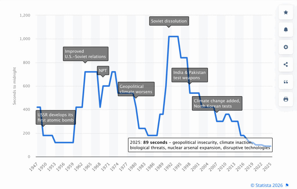 We are now in 2026, well below that limit and 4 seconds lower than last year from the Doomsday Clock value when I reported it in my Feb 25 newsletter. The picture of this month recalls the Statista overview from when the Doomsday Clock was created in 1947, just to give a picture of how things have evolved, but also how fast they can be improved when there is a common focus.