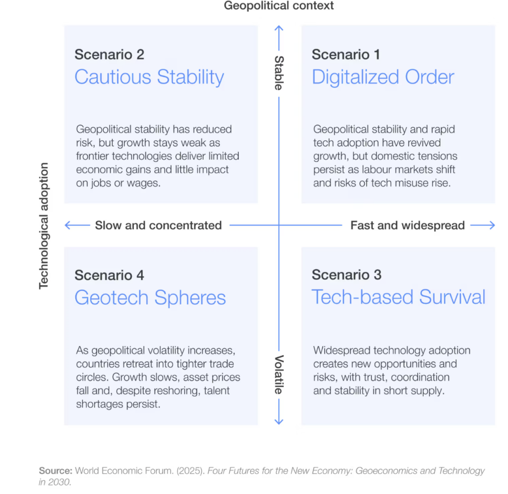 What I see as interesting from this different article is, first of all, the consideration of four possible scenarios based on the rate of adoption of technology and the geopolitical stability.