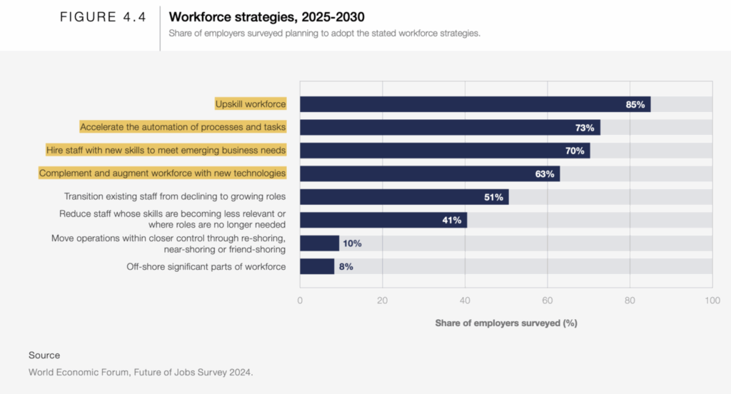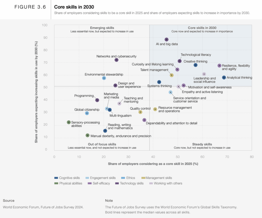 Avoiding repeating concepts and first opinions already shared in the former newsletter, I want to take only a few takeaways relevant to the new skills required in the future and start from there to analyze a few other aspects of the WEF 2025 Future Jobs Market Report.
