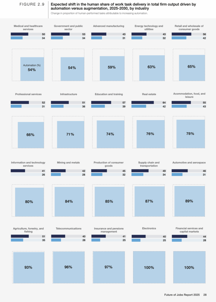 Different industries react with different percentages of automation, but what is visible is that for every industry, a certain number of tasks are being done manually (the ones marked in blue as done by persons predominantly) is reducing, in some cases less, due to the fact are most probably highly complex and specific, in some cases more.
