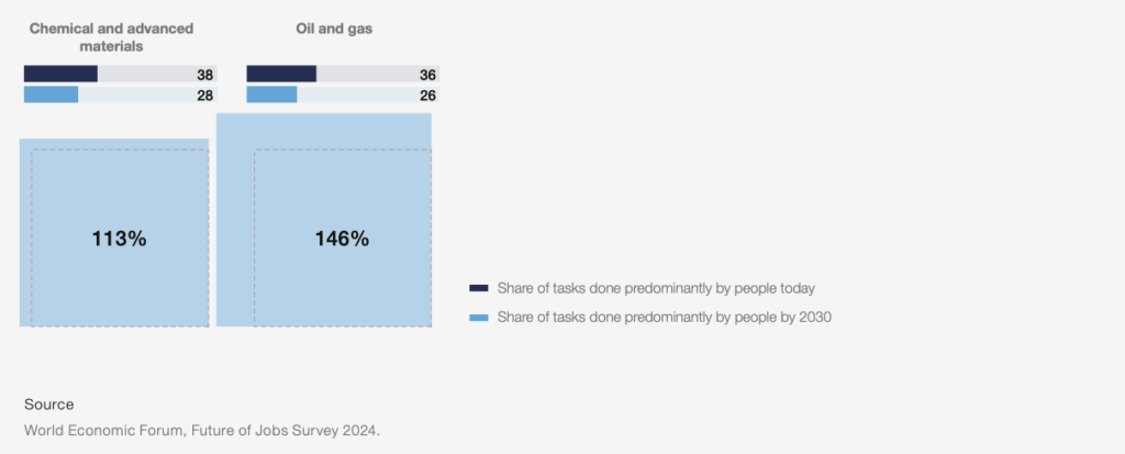 For all the tasks that are not considered predominantly done by people, which represent 60 to 70% of tasks in 2030, a big portion is predicted to be fully automated, meaning done by agentic systems without any human interaction, and a part of it, the white part of each of the squares, is the augmented part. So, for example, Pharma expects to have from half of the tasks predominantly done by people to 34 out of 100, and for the remaining 66 tasks, 55% of them would be automated (so no human work), and 44% would be done by humans with augmented AI.
