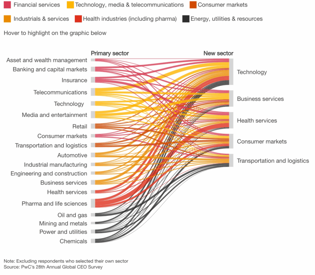 - An interesting overview from PWC based on surveyed CEO on the fact that many businesses over the last 5 years entered at least one new sector where technology is playing a key aspect of the major reconfiguration