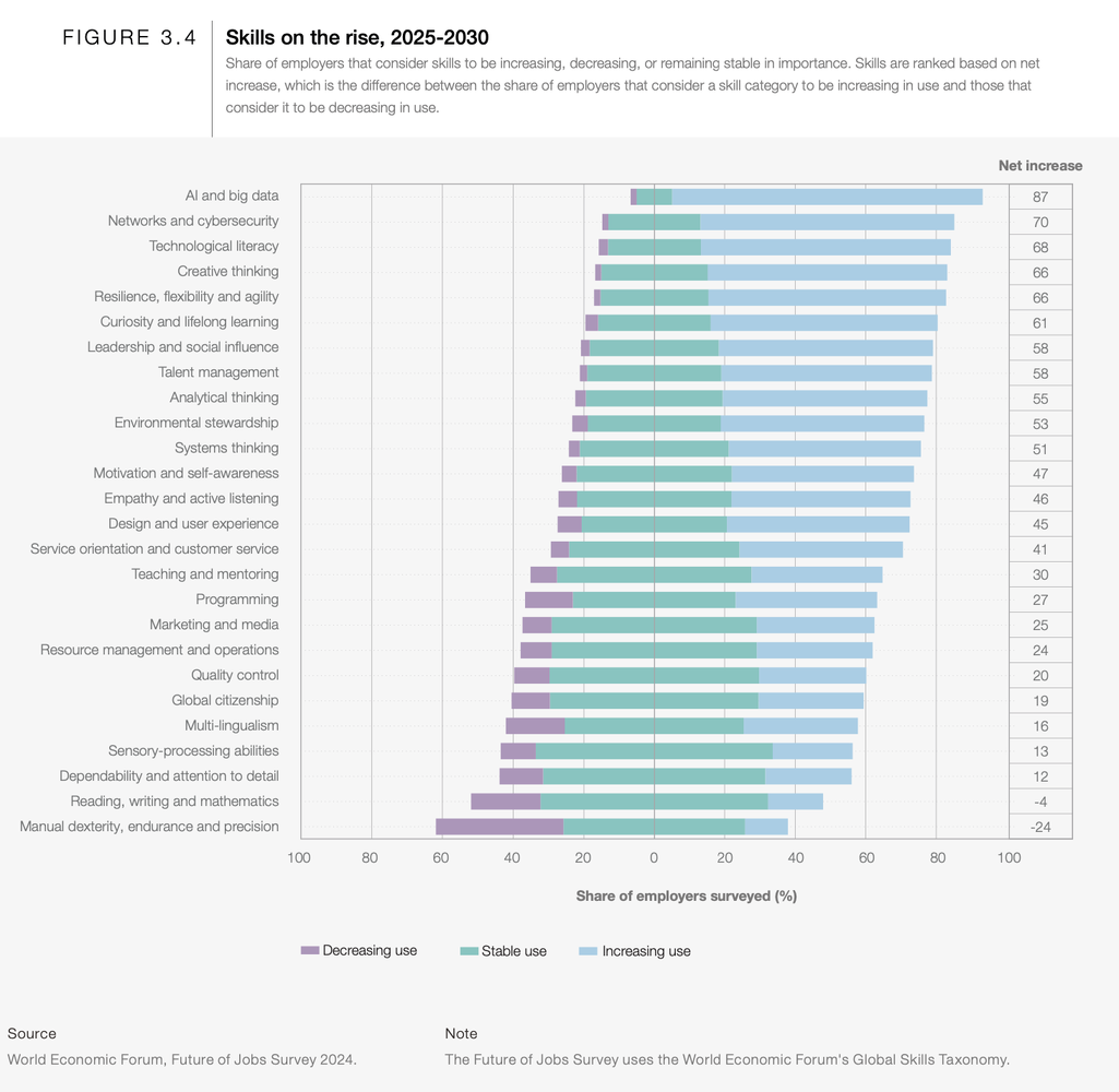 The major skills change is going to increase in the area of AI and big data, and decrease in the manual tasks. Here I put maybe some doubts on the overall assumption because for example the reading, writing and mathematics look less relevant where AI is more important but considering that ML (Machine Learning) a fundamental branch of AI is highly based on mathematics (matrix and tensors) and bigdata as well is highly regarding statistics and again is mathematic, maybe we need to understand the interpretation of some of these data also depending on the target audience of the survey.